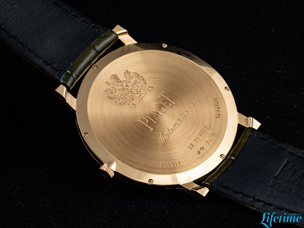 For the 910P, Piaget has turned to 18-carat yellow gold for the first time in this reference. The 41mm case has a total thickness of 4.3mm, and the solid caseback is engraved with the Piaget coat of arms. The watch is fastened with a yellow gold ardillon buckle over a green alligator strap.