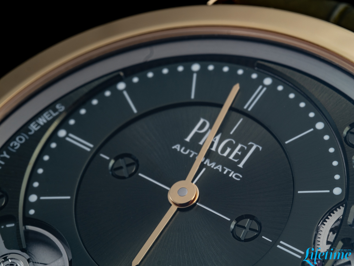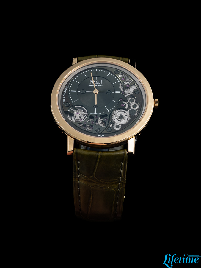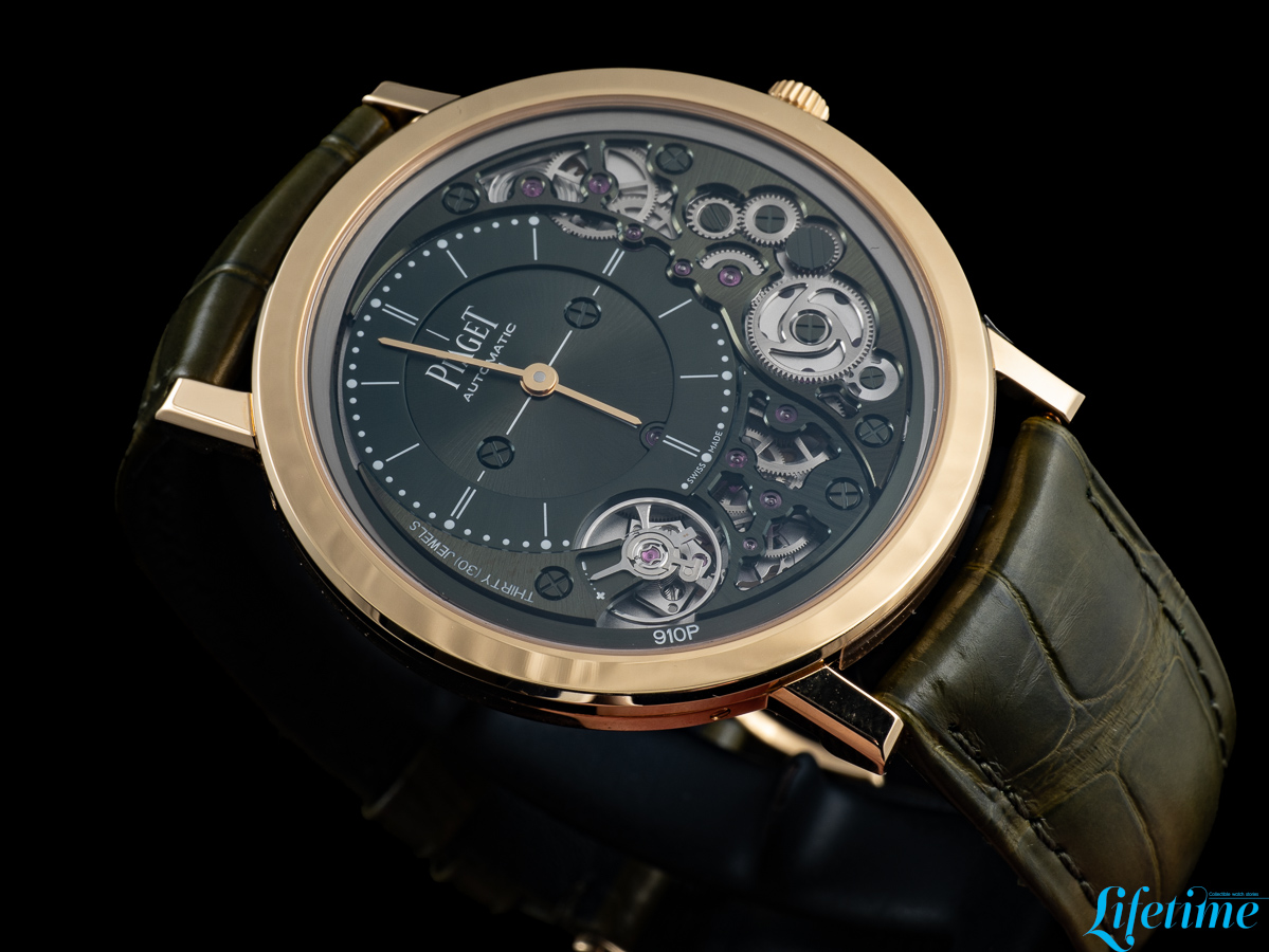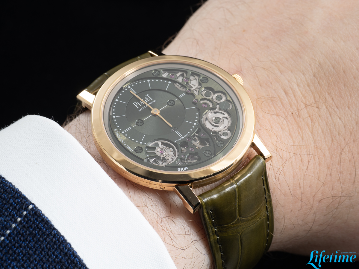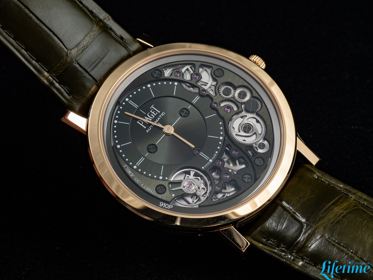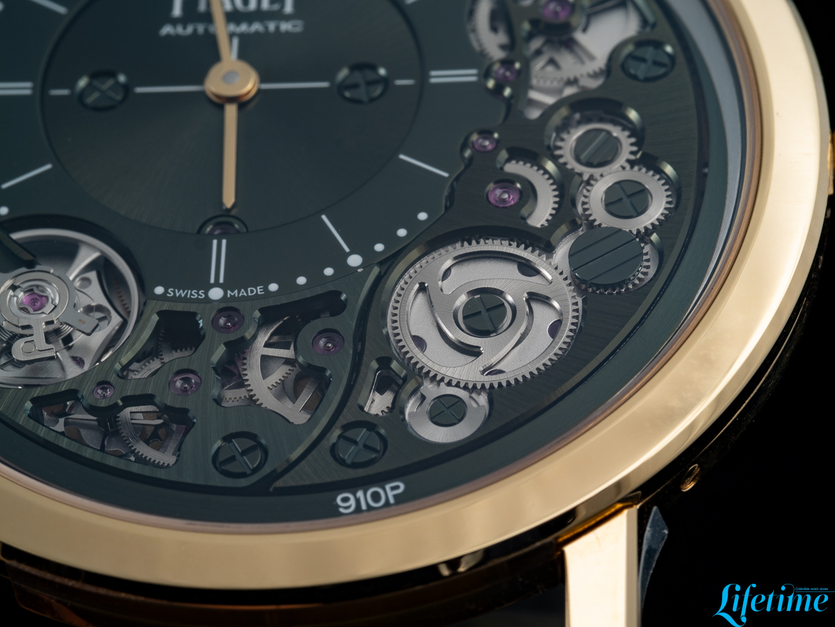 The 910P takes a coherent approach with bridges in the same khaki green, and a peripheral rotor in slate grey and green tones that adds depth without cluttering the view. Both watches also feature a subtle cross-shaped motif on the dial screws – a deliberate reference to Altiplano’s design heritage that comes across as genuinely thoughtful rather than merely ornamental.