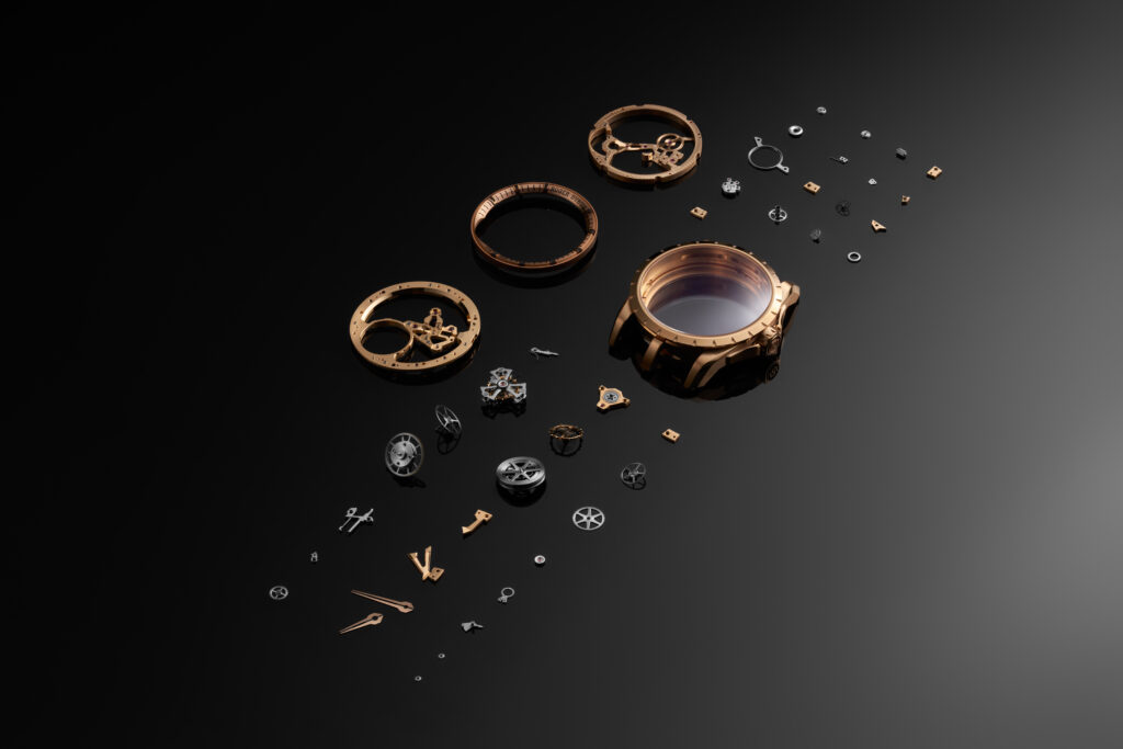 The 2000s brought other stylistic statements, from the double-dial Too Much to the Golden Square, which introduced the brand’s first in-house tourbillon in 2003. Then came the Excalibur in 2005—a defining collection with its dramatic triple-lug case and wide, open dial that encouraged creative skeletonization. The Excalibur Double Tourbillon added baroque flair and mother-of-pearl detailing, reflecting the brand’s growing confidence in storytelling through design.