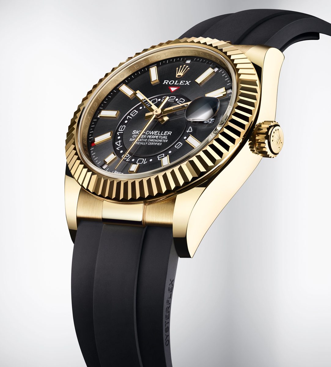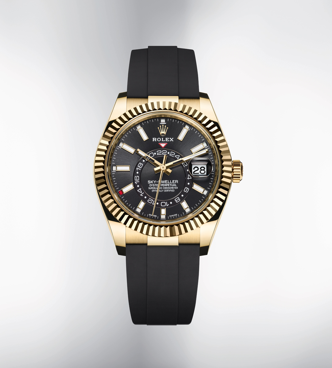 Last but not least – the Sky-Dweller. Rolex presents a new 18 ct yellow gold version of its Oyster Perpetual Sky-Dweller, fitted with an Oysterflex bracelet. The watch is the first in the Classic category to include this innovative bracelet made of high-performance elastomer. It also features a bright black, sunray-finish dial with hands and hour markers in 18 ct yellow gold. The light reflections on the case sides and lugs highlight the profile of this 42 mm Oyster case.