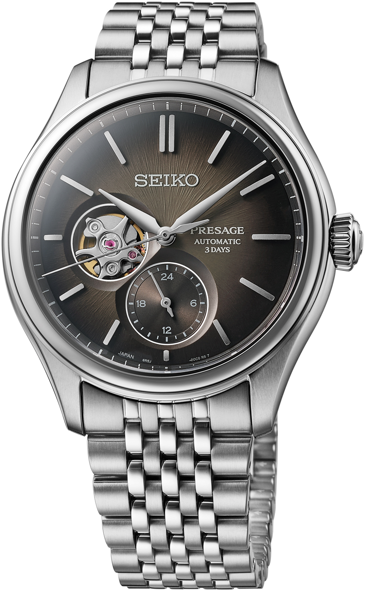 Three of the watches have the classic three-hand configuration with central seconds and date, while the remaining two bear a 24-hour scale and a dial opening onto the movement’s escapement at 9 o’clock. Powering each new watch is one of two recently introduced Seiko 6R movements that run for 72 hours, ensuring that a watch removed Friday evening will be ready to wear on Monday morning without having to be reset. The three-hand watches with date use Caliber 6R55, while Caliber 6R5J powers the open-heart watches. Each movement’s gold-colored oscillating weight is visible through an exhibition case back.