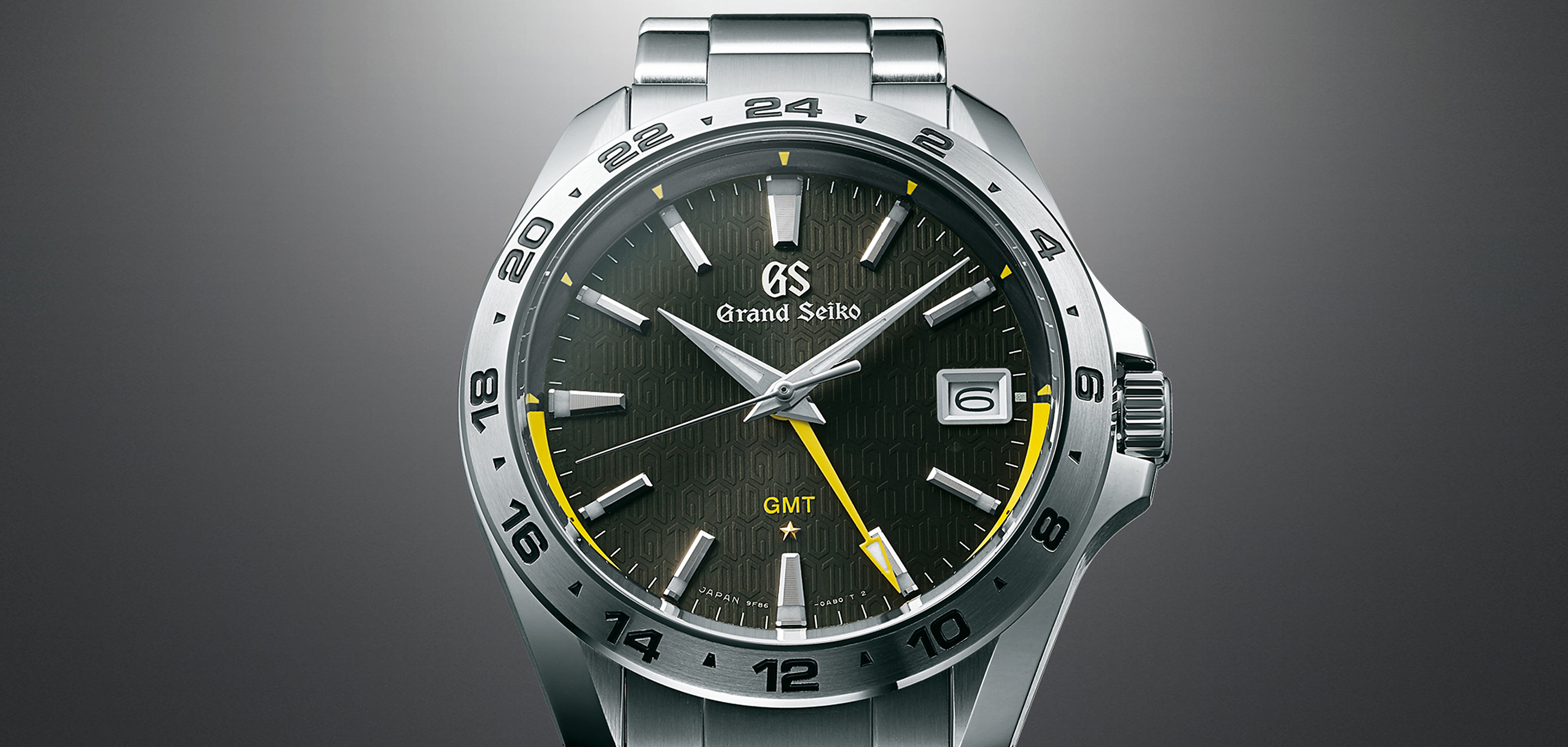In both performance and design, this new limited edition is the perfect embodiment of the values and high standards that 9F has always represented. The metallic charcoal dial features a unique pattern based on the traditional Quartz symbol to commemorate the 25th anniversary of Caliber 9F. It also carries the five-pointed star that symbolizes Grand Seiko’s special level accuracy and, at the 25 minute position, the dial pattern is subtly different; the symbols 9F and 25 are discreetly shown as a permanent reminder of the caliber’s anniversary. The outer rim of the dial, from three o’clock to nine, is picked out in vivid yellow to display at a glance whether the GMT hand indicates AM or PM.