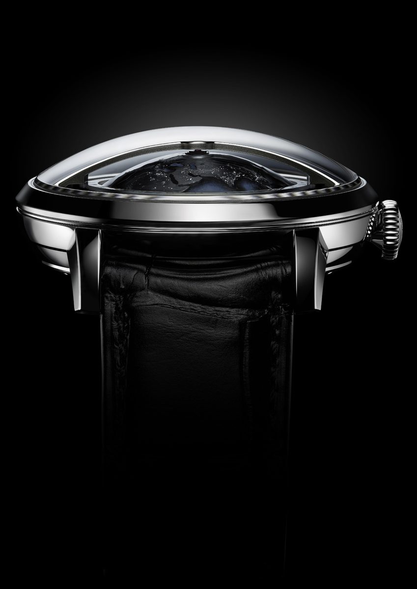 Beneath a large sapphire crystal dome, an arch supports a half-globe in shades of grey and blue. It depicts the continents, the seas and the lights of the large cities located north of the equator. On the edge of the planet, a sapphire ring breaks down the 24 hours of a day. Transparent between 6 am and 6 pm, a metal treatment has been used to darken it, indicating the night-time hours. Together, the hemisphere and ring display the time in one part of the world, represented in a highly original way. In the absence of a dedicated hand or city disc, the time is read geographically in accordance with the continents.