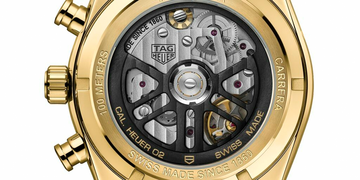 The case back features a sapphire crystal through which the movement and custom black oscillating mass are clearly visible. The TAG Heuer Carrera Chronograph is powered by the Calibre Heuer 02, the brand’s in-house chronograph movement. With its vertical clutch and column wheel it provides outstanding timekeeping precision and performance along with a power reserve of 80 hours. The piece is presented on a large-scale black alligator strap with a gold pin buckle.
