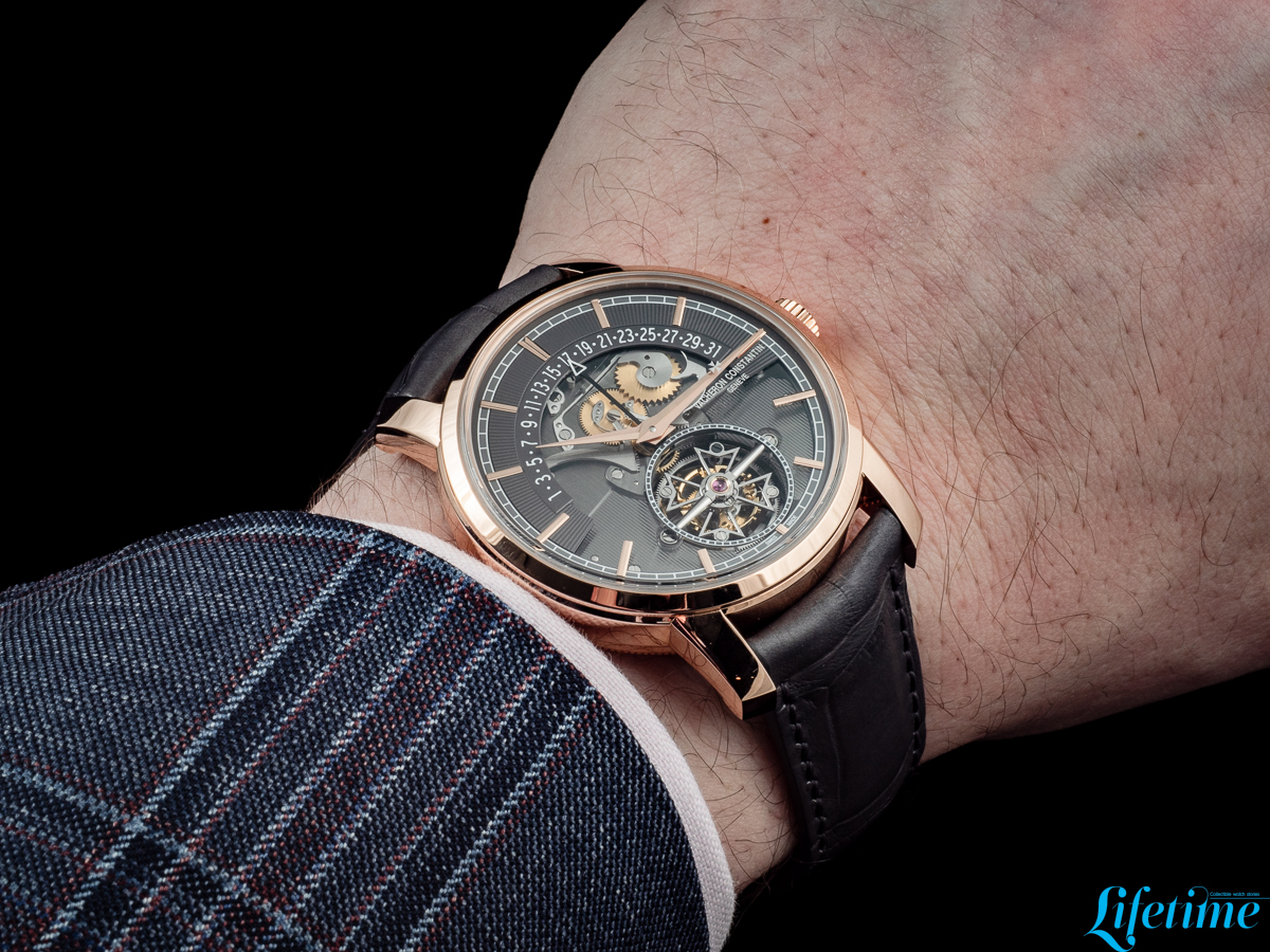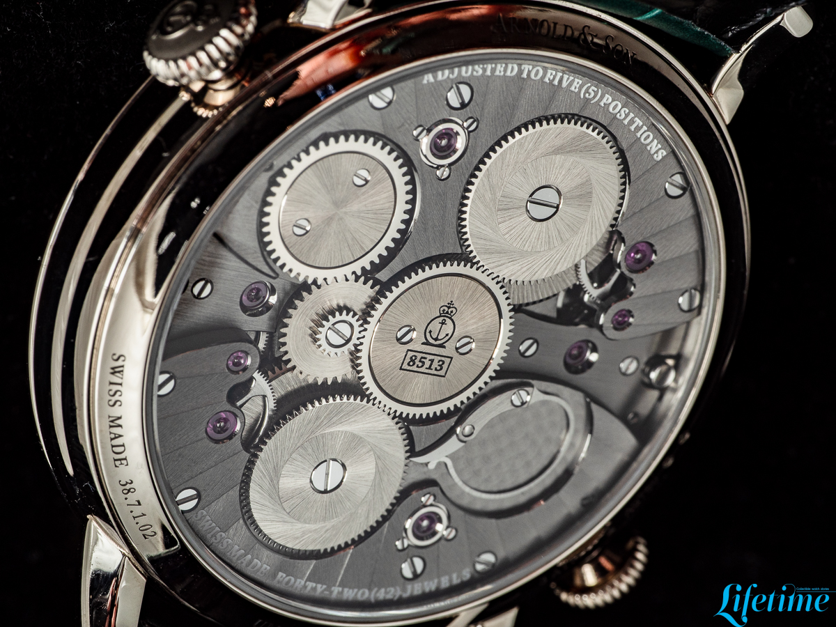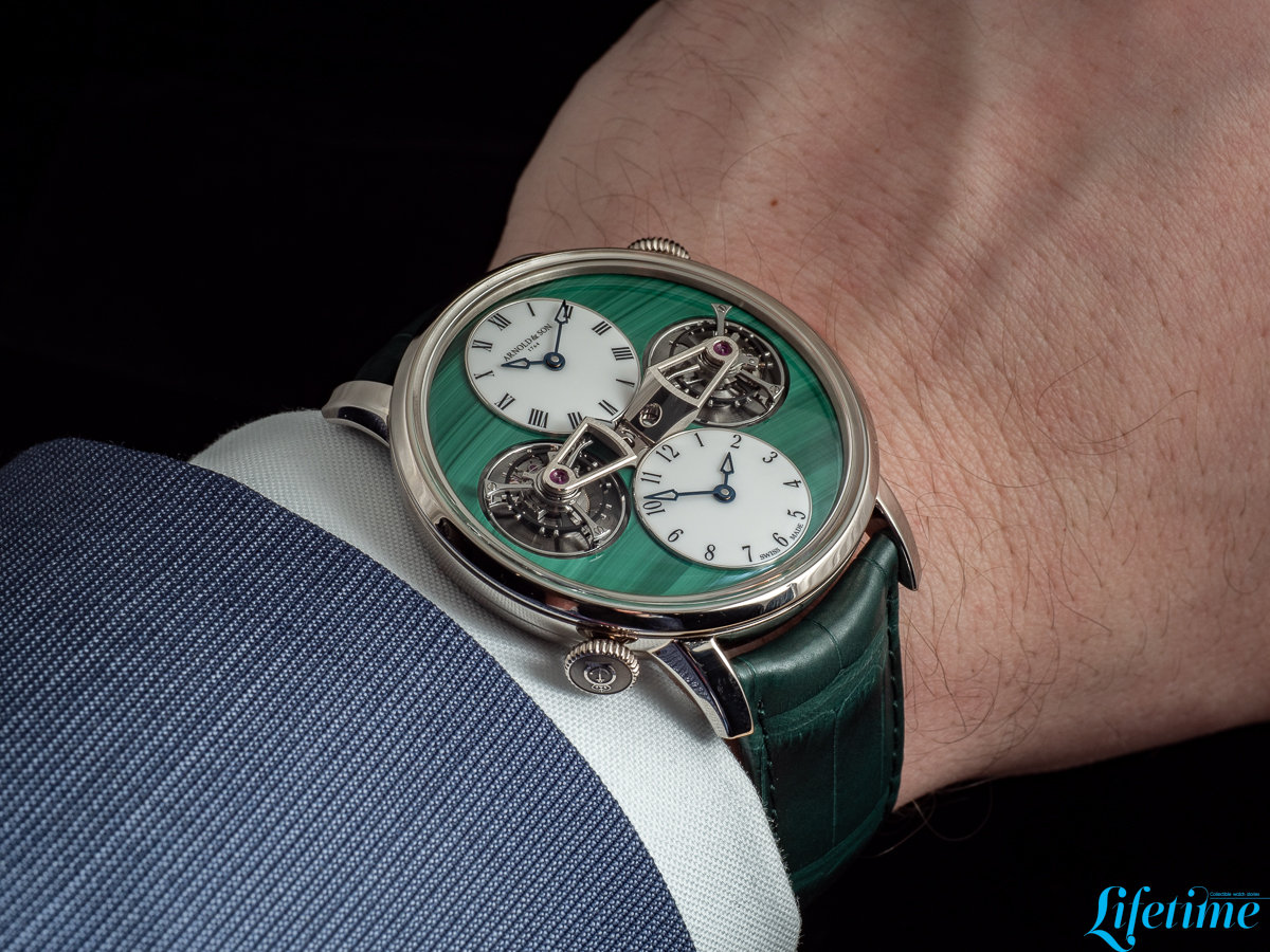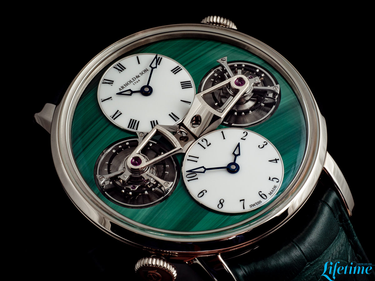 A brand not so much in the public eye but with exceptional timepieces, Arnold & Son reiterates its double tourbillon with a precious stone dial. Two independent tourbillons drive two independent dials, making it an exceptional travel wristwatch. Being completely independent, each dial can be set to the minute, thus covering quarter- or half-hour time zones. Two barrels ensure a 90-hour power reserve. A green beauty with two brains rarely seen in the wild by ordinary people.