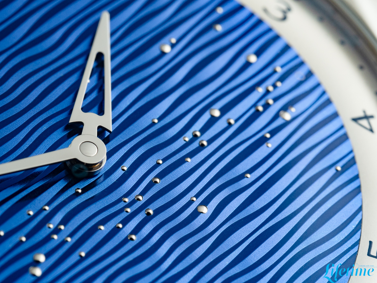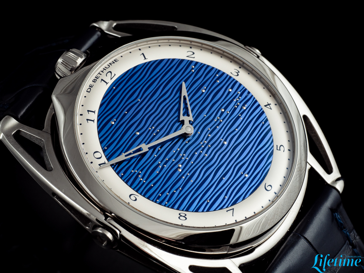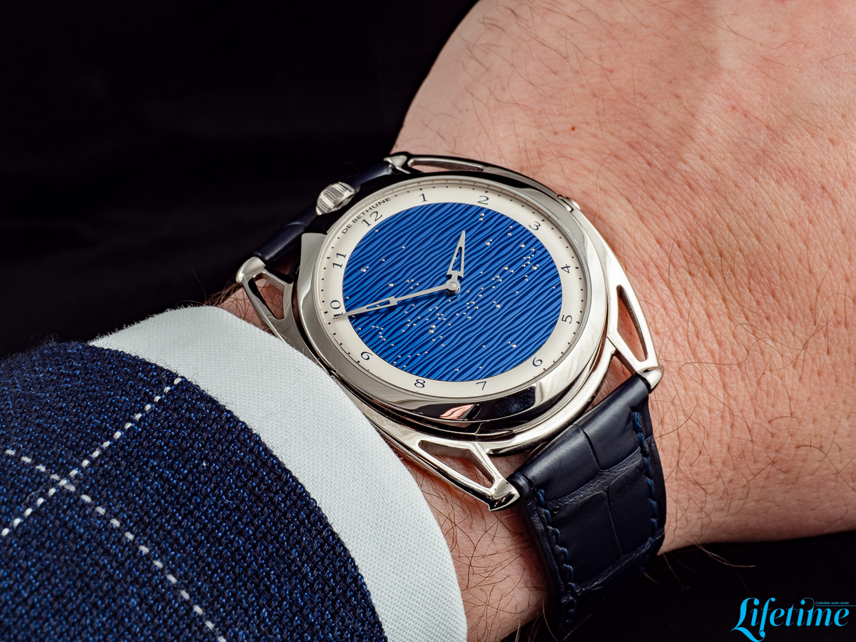 Again, as one would expect – a fantastic independent with exceptional finishes and a blue dial – a 39mm DB28 featuring blue waves at night reflecting the starry sky. The novelty, besides the reduced size, is the random guilloché pattern (a world first) that creates a blued titanium wave on the dial. The back of the watch displays a pure De Bethune style with an innovative double antishock system for the titanium balance wheel with white gold inserts and the bridge. The weapon of choice in this fantastic battle of the visual sense is titanium, found in unusual places and with amazing finishes.