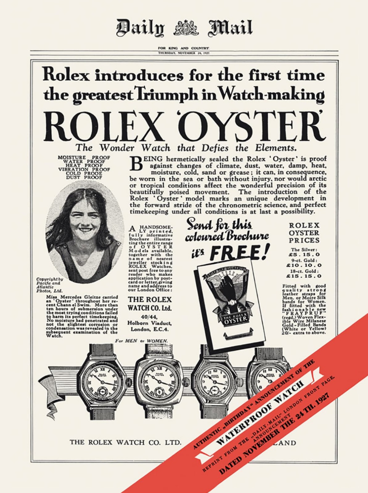 News of that triumph spread rapidly. Hans Wilsdorf seized the moment, taking out a full-page ad in London’s Daily Mail to announce “the debut of the Rolex Oyster and its triumphant march worldwide.” Mercedes Gleitze thus became Rolex’s inaugural Testimonee, embodying both daring achievement and the promise of truly waterproof performance.