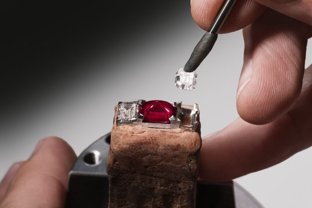 Technical restraint underpins the visual drama. The maisons’ choice of emerald cuts for both diamonds and coloured stones reinforces the watch’s rectangular, step-faceted aesthetic, privileging clarity and the stone’s body colour over scintillation. For the central jewel piece, a rare sugarloaf cut reintroduces an ancient, domed silhouette that modulates light differently from faceting, deepening colour and lending a quietly aristocratic presence.