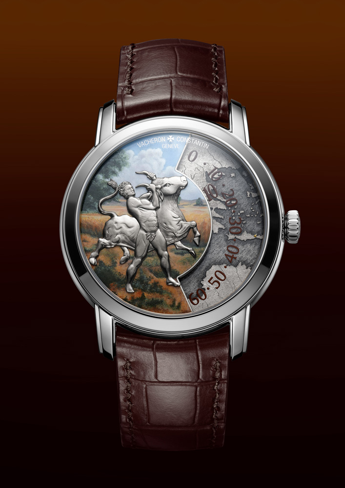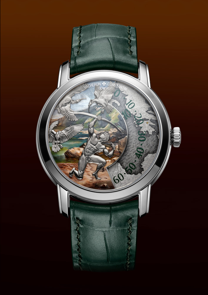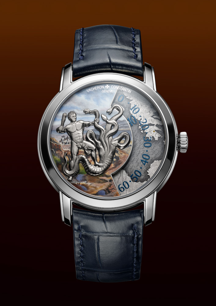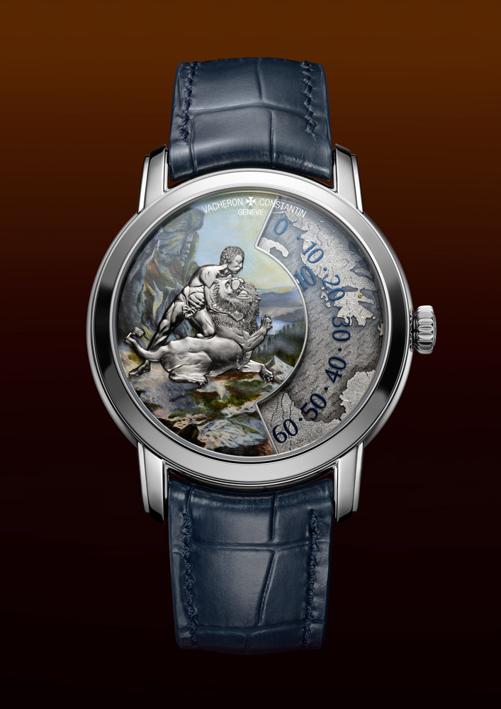 The Les Cabinotiers Labours of Heracles watches by Vacheron Constantin pay tribute to the legendary Greco-Roman hero through miniature masterpieces that depict four of his twelve mythic tasks. Each watch features a two-level dial crafted from 18K white gold, combining grand feu enamel, miniature painting, and micro-sculpture to evoke the drama and artistry of Heracles’ epic journey. Housed in a 40mm white gold case, these timepieces are powered by Calibre 1120 AT, a self-winding movement that uses a wandering hours display to indicate minutes along a fixed arc—an inventive mechanism driven by a patented Maltese cross-shaped system.