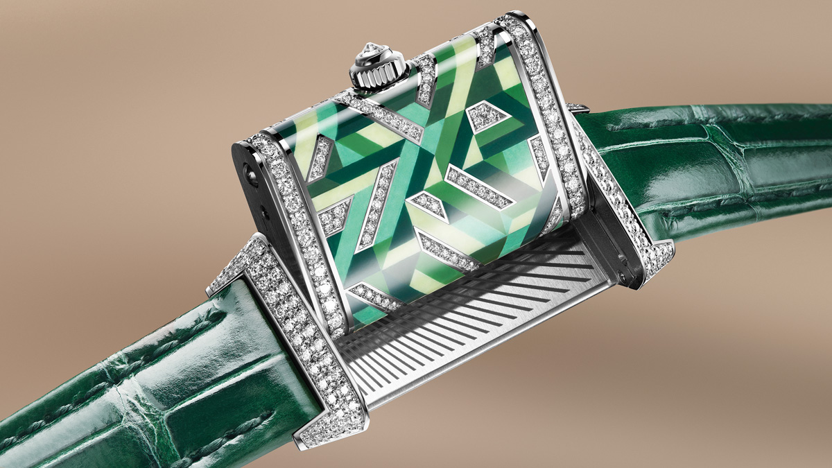 The Reverso One Precious Colours exemplifies this approach, with its lavishly decorated case paying homage to the Art Deco style. The entire caseback and sides are covered with a dazzling geometric motif, executed in miniature-painted grand feu enamel with diamond accents, creating an optical illusion of depth and movement. Creating this kind of decoration requires absolute mastery of multiple crafts. The enamelling process alone involves up to 15 firings at 800 degrees Celsius, with the enameller carefully hand-painting each geometric shape with a very fine-tipped brush. After enamelling, the case is passed to the gem-setter, who must work with exceptional precision to set each diamond without disturbing the finished enamel. The entire process represents approximately 140 hours of meticulous handwork.