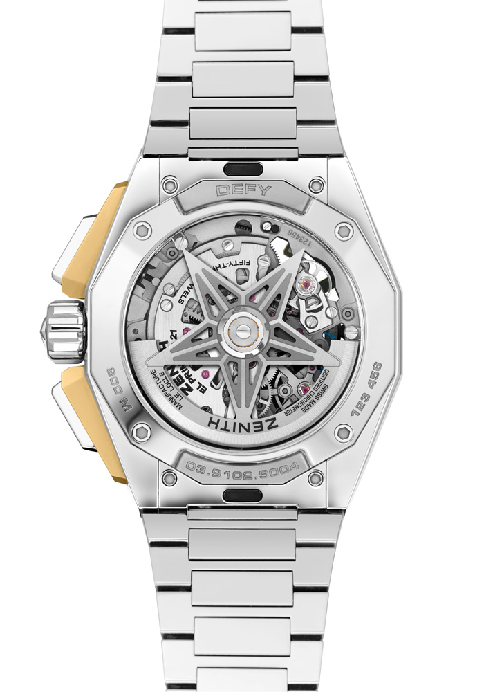 The openworked dial showcases the movement’s kinetic architecture, with the chronograph seconds at 6 o’clock, chronograph minutes at 3 o’clock, the power‑reserve display at 12 o’clock and the small seconds at 9 o’clock. Through the sapphire caseback, the view continues with the signature star‑shaped rotor in a satin‑brushed finish, a modern emblem of ZENITH’s watchmaking savoir‑faire.